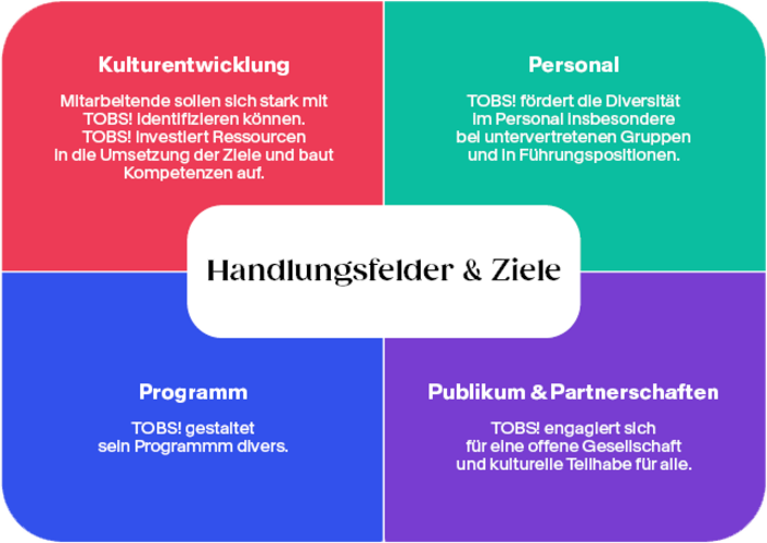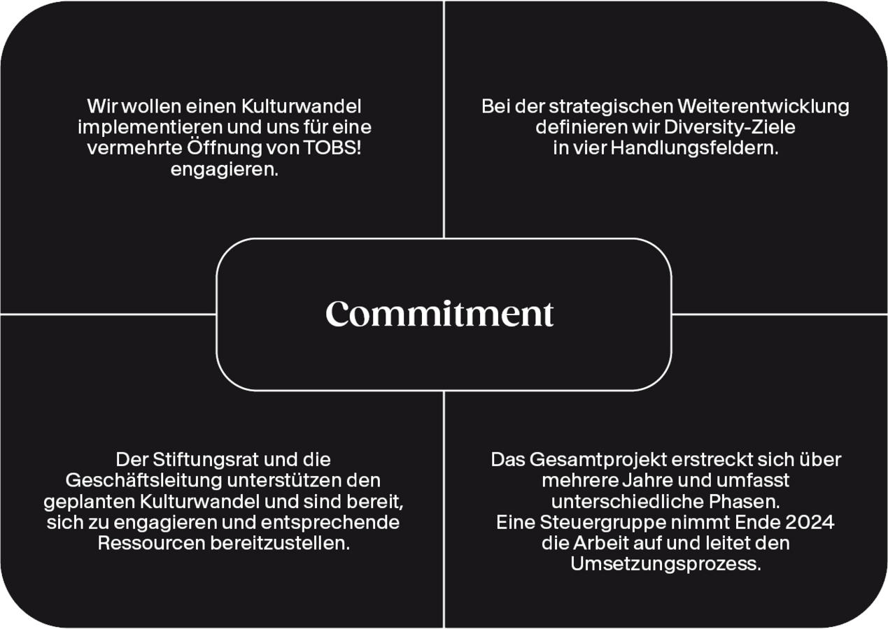 Wir wollen einen Kulturwandel implementieren und uns für eine vermehrte Öffnung von TOBS! engagieren. Bei der strategischen Weiterentwicklung berücksichtigen wir verschiedene Aspekte von Diversität. Der Stiftungsrat, die Direktion und die Personalvertretungen unterstützen den geplanten Kulturwandel, eine Kerngruppe Diversity zur Steuerung der Umsetzung ist im Aufbau begriffen.